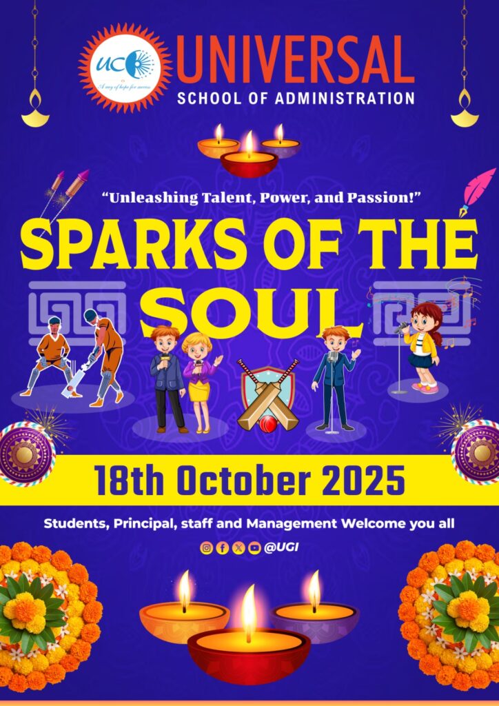 The Universal School of Administration celebrated its vibrant annual event “Sparks of the Soul” on 18th October 2025, a festival of creativity, competition, and camaraderie. With the theme “Unleashing Talent, Power, and Passion!”, the event brought together students from diverse disciplines to showcase their energy and innovation through sports, cultural performances, debates, and artistic expressions.