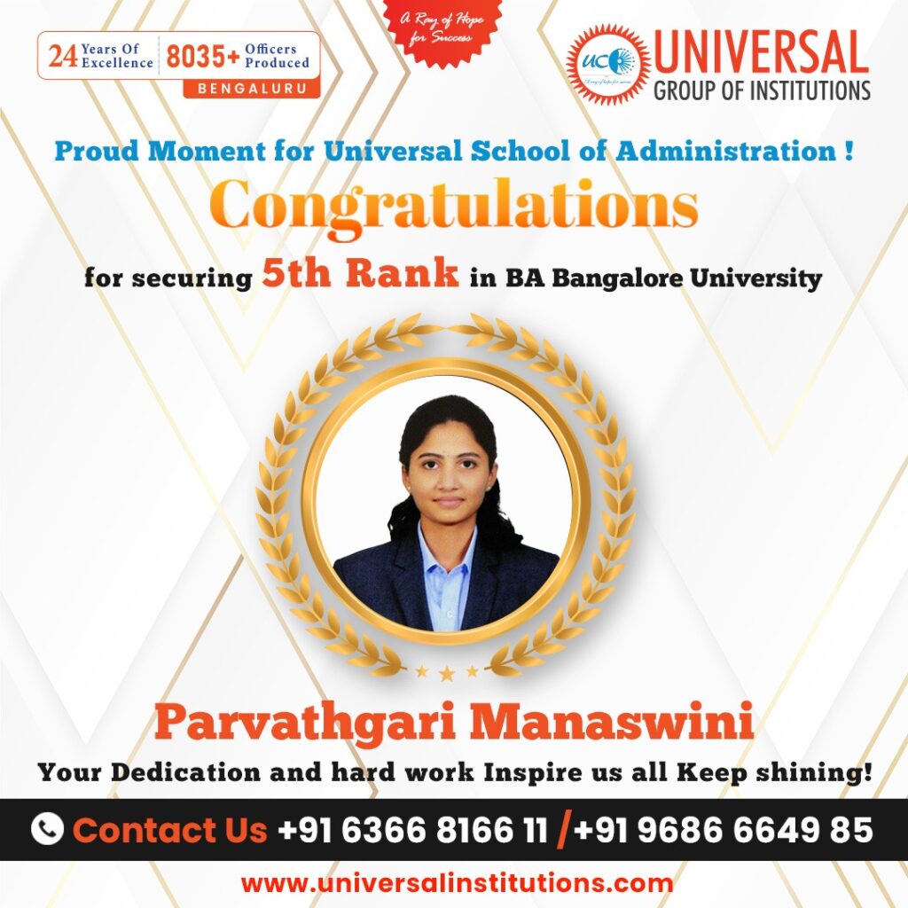 We are proud to announce that Parvathgari Manaswini, a final-year student at the Universal School of Administration, Bengaluru, has secured the 5th Rank in the Bachelor of Arts program under Bangalore University. This remarkable academic milestone reflects her unwavering commitment to excellence and the institution’s enduring focus on nurturing high-performing individuals prepared for academic and administrative careers.