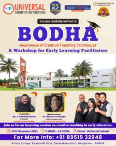 Universal Group of Institutions is proud to present BODHA – Awareness of Creative Teaching Techniques, a dedicated workshop designed to empower Kindergarten Principals, Heads, and Early Learning Facilitators. Scheduled for 29th November 2025 at the serene Universal Campus, Koluru Village, this workshop aims to spark fresh ideas and reimagine classroom creativity in the foundational years.