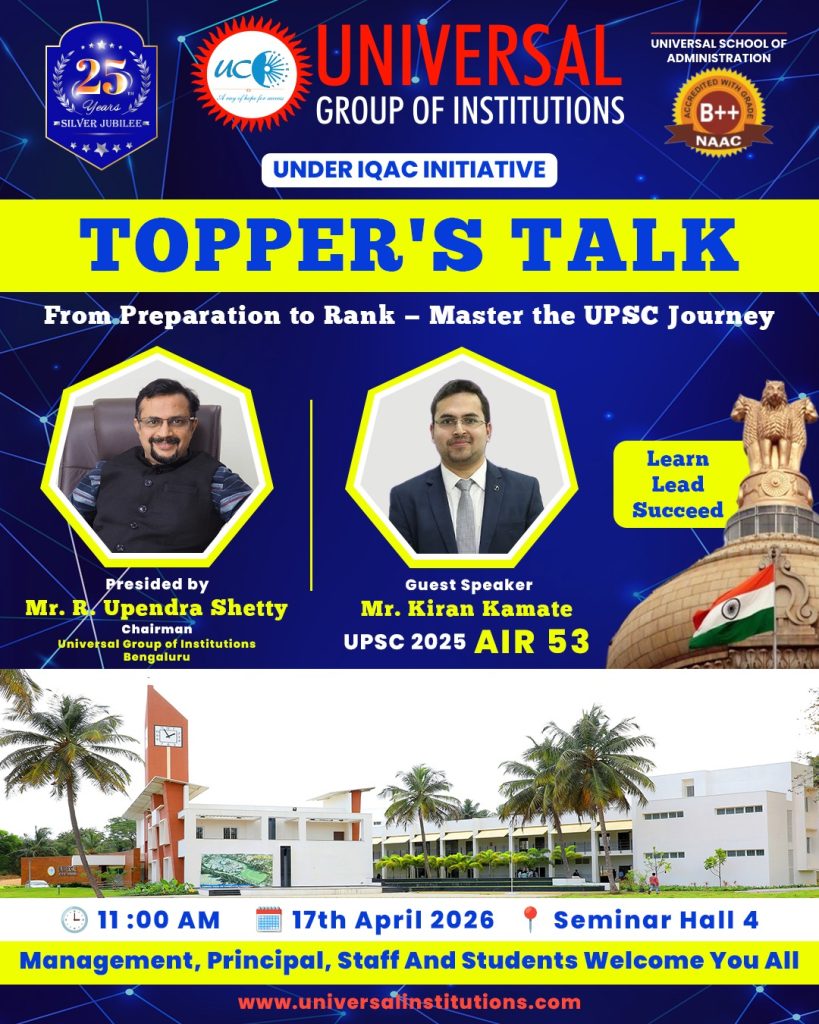 Universal Group of Institutions, Bengaluru, proudly hosted an inspiring Topper’s Talk under the IQAC initiative, bringing together aspirants, faculty, and academic leaders on a single platform. The session was presided over by Mr. R. Upendra Shetty, Chairman, and featured an insightful address by Mr. Kiran Kamate (UPSC 2025 AIR 53).