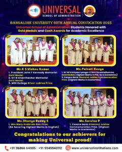 The Universal School of Administration proudly congratulates its exceptional students who were honored with Gold Medals and Cash Awards for their academic excellence at the Bangalore University 60th Annual Convocation 2025. The ceremony was a proud moment for the institution as our students received accolades for their hard work and dedication.